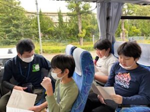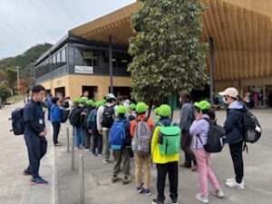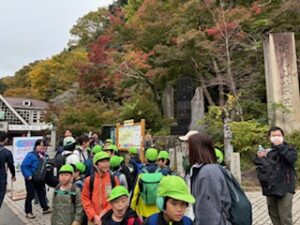 バスではスリーヒントクイズで盛り上がりました。ここから登山チームとケーブルカーチームに分かれて頂上を目指します。少し紅葉して来ている高尾山の麓です。