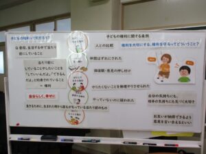 小金井市が多摩地区で一番早くに『子どもの権利に関する条例』を制定したのが平成21年。今日は、子どもオンブズパーソンの半田先生から、権利について学びました。ゲームをする権利、オシャレをする権利など、たくさんの権利がありますが、「ブランコに乗っているとき小さい子が並んで待っていたら?」の問いかけに、子どもたちからはたくさんの反応がありました。そしてその姿を見ていた方々からは、たくさんお褒めの言葉をいただきました。