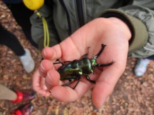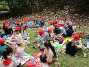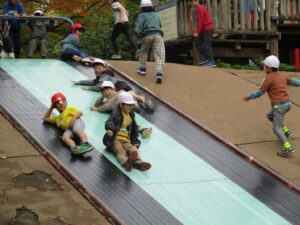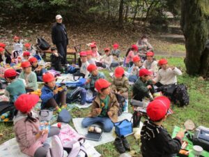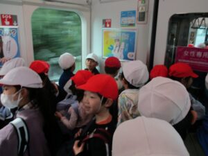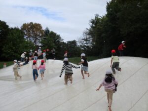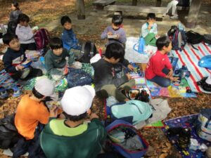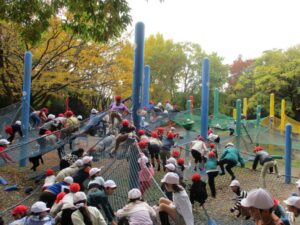 電車で西立川まで行き、入園するなり虹色に輝くクワガタを発見。遠足に来るには少し遅い時期だったからか、ほかの学校や幼稚園、保育園の子もおらず、貸し切り状態で虹のハンモックやふわふわドームで思い切り遊びました。子どもたちにとっては、きれいな紅葉よりもお弁当や遊びに夢中だったようです。疲れた様子でしたが、しっかりペアの子同士で手をつなぎ、2年生が1年生をリードしながら学校まで帰ってくることができました。