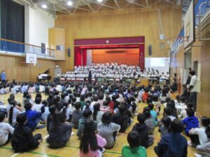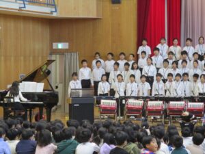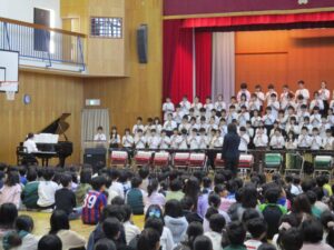 今朝は体育館で音楽集会があり、5年生が明日の連合音楽会で演奏する曲を披露してくれました。