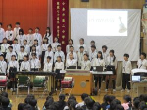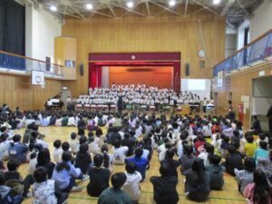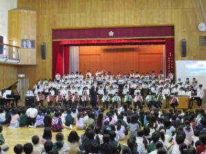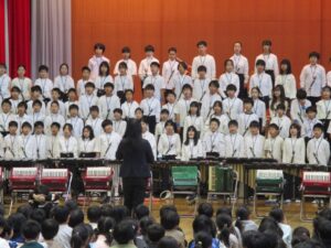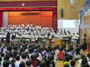 衣装をばっちりと決め真剣な表情で演奏していた5年生に、在校生たちから大きな拍手が送られていました。昨日の保護者向けの演奏からレベルアップした5年生の子どもたちには、まだまだ伸びしろがありそうです。。