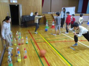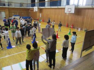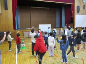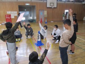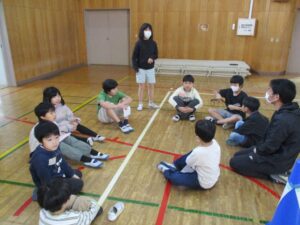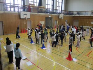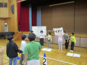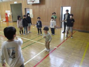最初の自己紹介くらいまでは、やや硬い感じでしたが、「爆弾ゲーム」や「縄跳び」、「ボーリング」や「だるまさんが転んだ」などのゲームを通して、どんどん笑顔が増えていきました。そして、最後の『猛獣狩りに行こうよ』では、声を掛け合ってグループを作っている姿がとても印象的でした。