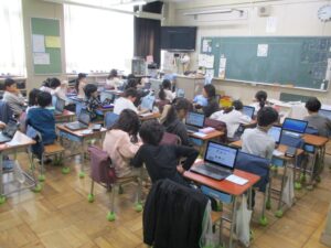 担任だけでは大変なので、モジュールの時間に6年生のお兄さんやお姉さんたちがサポートしてくれました。ただ、6年2組と3組が学級閉鎖で不在のため、1組が3クラスに分かれて対応してくれました。