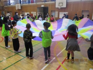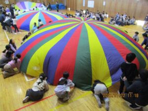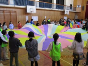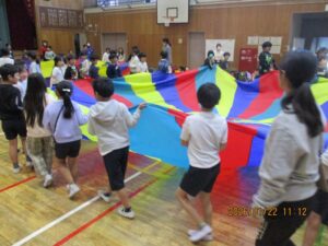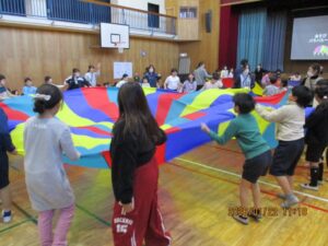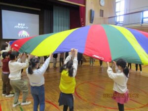 前回は、特別支援学校を訪問しましたが、今回は二小に来てもらいました。司会はさくら学級の6年生で、はじめの言葉や終わりの言葉は3年生が担当しました。まず、特別支援学校の3年生は「エビカニクス」を楽しく踊って見せてくれました。それに応えて、二小は「歌えバンバン」を披露しました。そして、合同で3か所ずつ2回に分けて「パラバルーン」で遊びました。最後は「にじ」を一緒に歌い、花道をハイタッチしながら帰ってもらいました。
