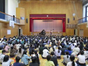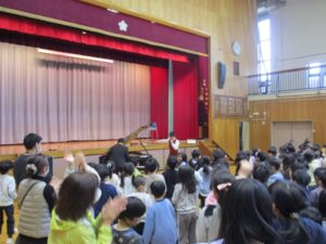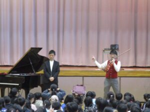 演奏してくれた二人は兄弟なので、ディズニーメドレーなど息ぴったりの演奏でした。そして、さくら学級、1年生から4年生までの子どもたちはジャンプをしたり拍手をしたり、目をつぶって聴いているときは音がよく響いて聴こえました。また、二人は二小の卒業生なので、最後にアンコールで一緒に歌った校歌もさらに息ぴったりでした。