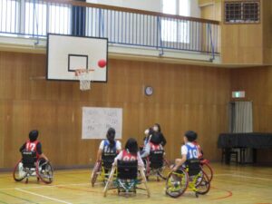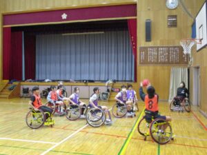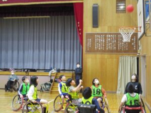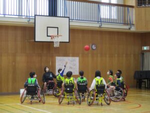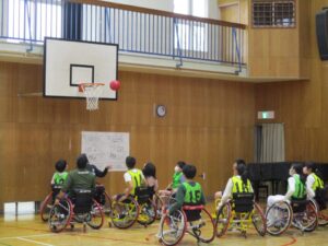 今日は、6年生が車いすバスケットボールの体験をしました。