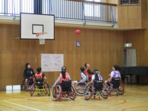 車いすバスケットボール女子日本代表選手の小田島理恵選手と女子日本代表のキャプテンとして長年ご活躍された多智利枝さんにお越しいただきました。まっすぐ進みたいのに進めなかったり、座ったままシュートするのが難しかったり、それでも苦労しながら皆でバスケットボールを楽しむことができました。